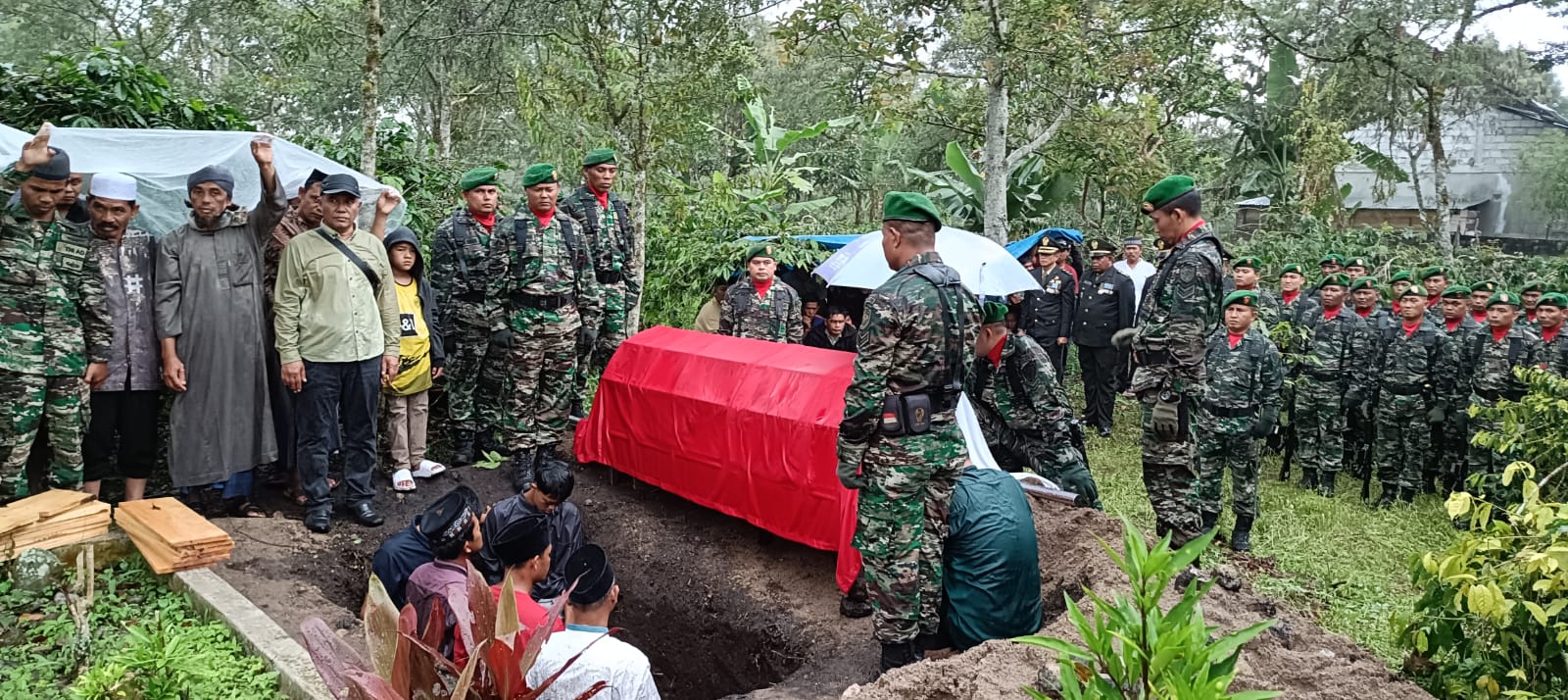 Keizalinnews.Online|Redelong-: Kodim 0119/BM – Komandan Kodim 0119/BM Letkol Inf Ahmad Fauzi memimpin Upacara Militer pemakaman Serma (Alm) Hasimi Anggota Koramil 01/Bandar, yang meninggal dunia karena sakit Abses Serebri di RS Muyang Kute Bener Meriah. Almarhum meninggalkan 1 orang istri dan 4 orang anak. Pemakaman dilaksanakan di Pemakaman Keluarga Desa Bener Ayu, Kecamatan Wih Pesam, Kabupaten Bener Meriah, Jum’at (25/04/2025).