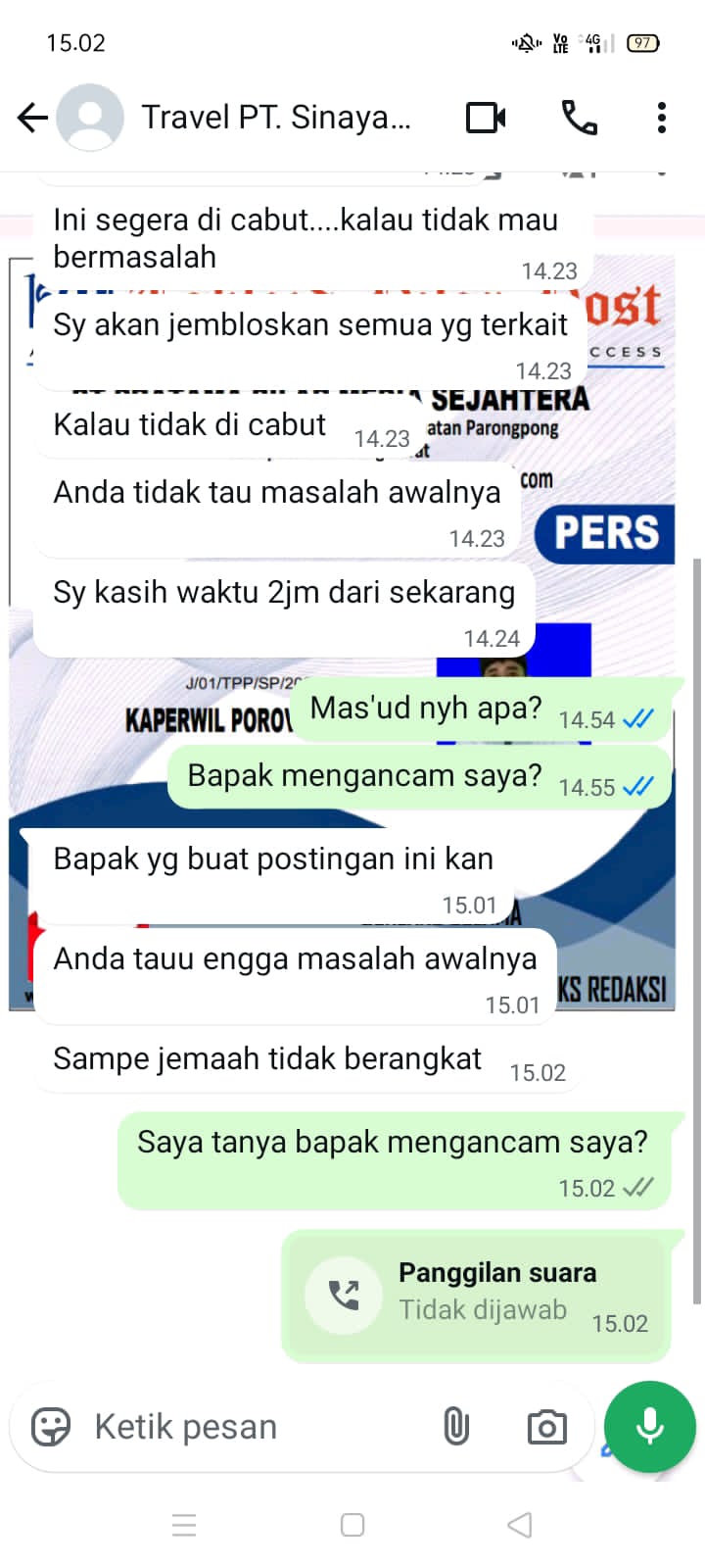Dalam percakapan via WhatsApp pada Kamis, 24 April 2025, pihak PT Sinaya Amanah Wisata diduga mengancam sdr Ahmad Khotib akan di jebloskan ke penjara jika tidak mencabut berita yang dimuat.