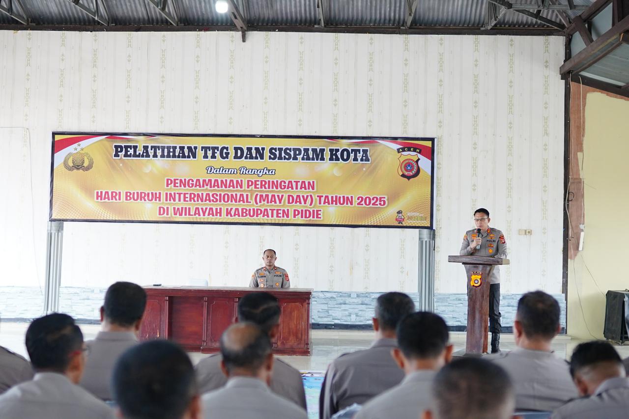 Kapolres Pidie AKBP Jaka Mulyana, SIK, MIK menjelaskan beberapa hal teknis terkait pengamanan yang akan dilakukan. TFG merupakan salah satu bentuk untuk mengaplikasikan bagian dari tugas personil di lapangan saat bertugas.