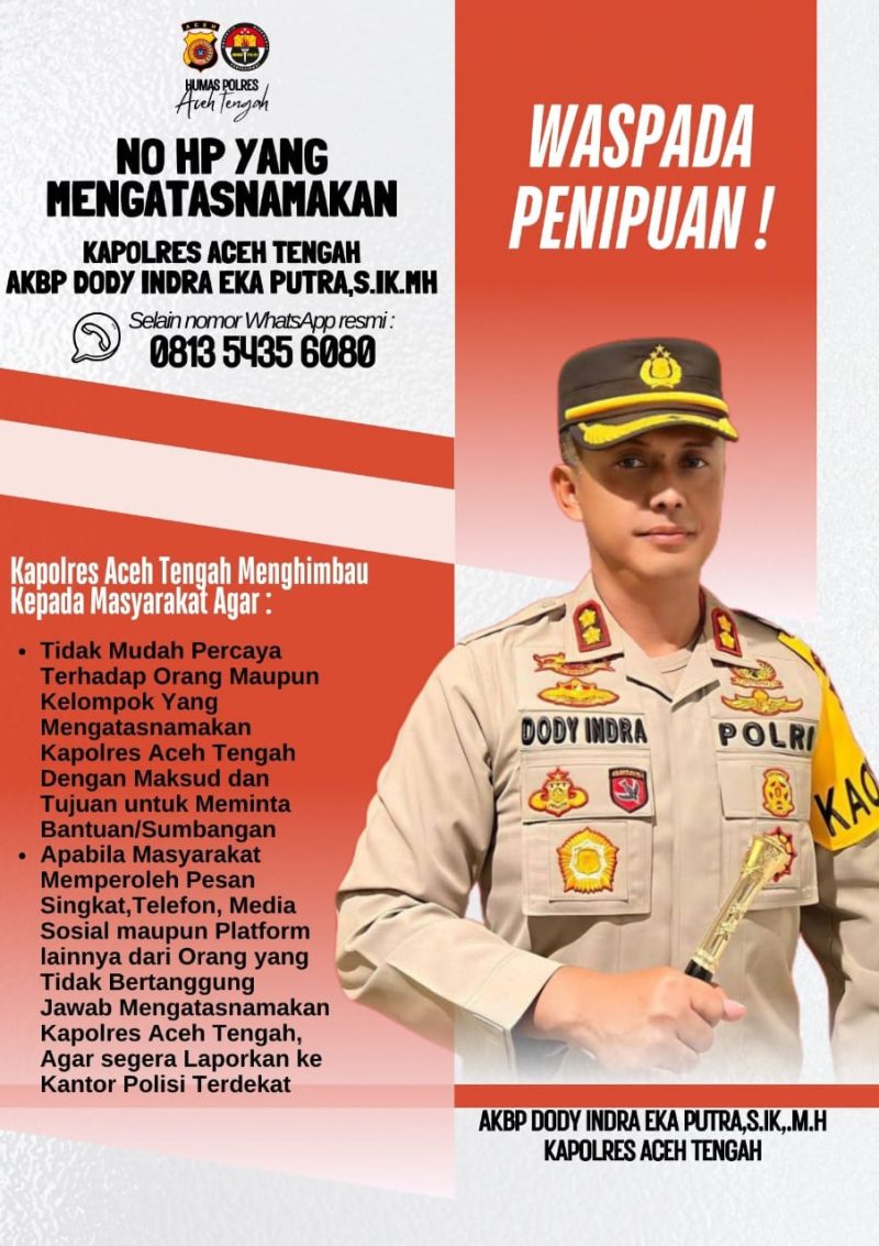 Keizalinnews.web.id|Takengon-: 20 Mei 2025 – Kapolres Aceh Tengah, AKBP Dody Indra Eka Putra, mengimbau masyarakat untuk meningkatkan kewaspadaan terhadap modus penipuan yang mengatasnamakan dirinya melalui aplikasi pesan WhatsApp dan Instagram.