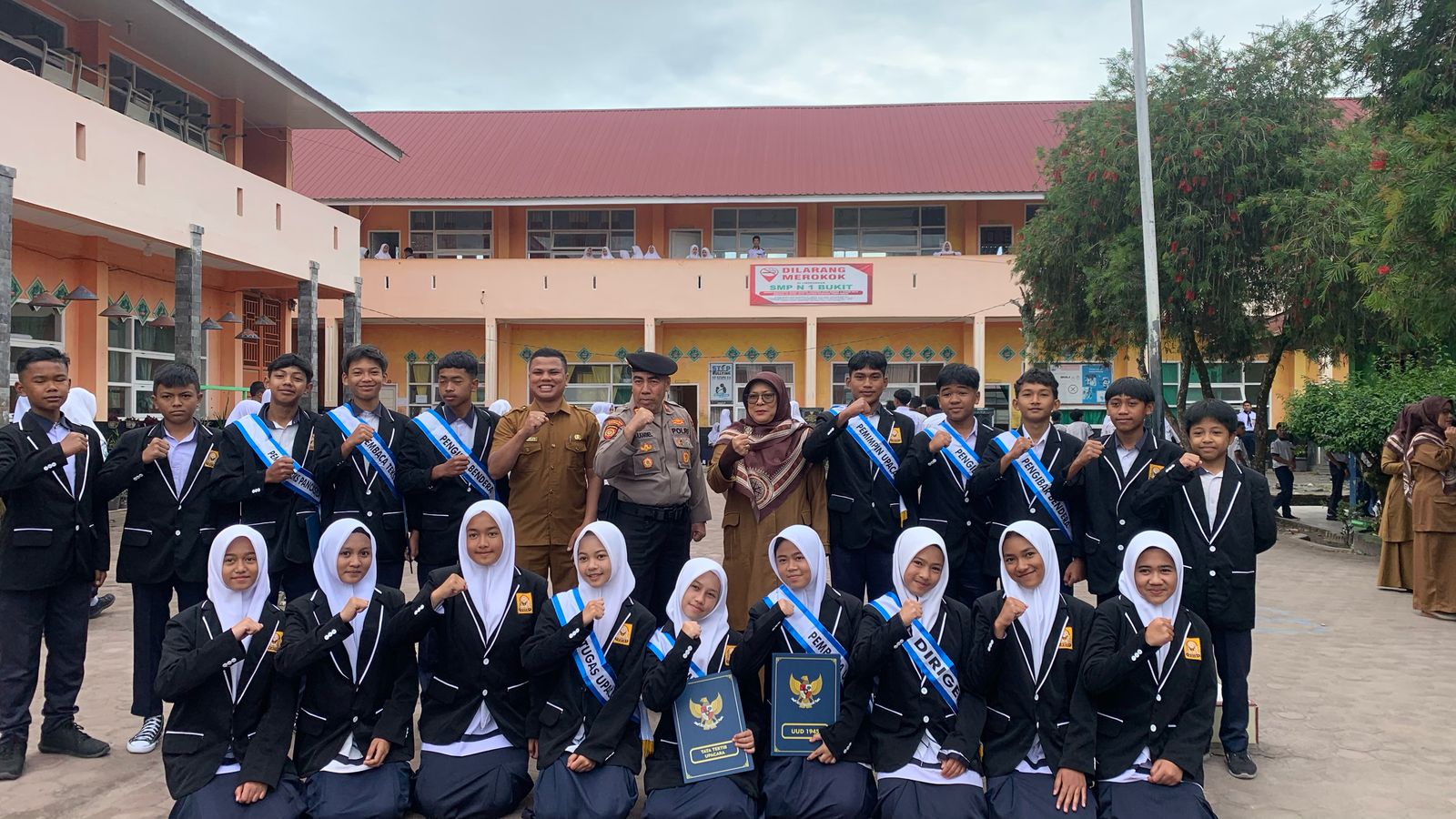 Upacara yang berlangsung sejak pukul 07.30 WIB tersebut diikuti oleh seluruh siswa dan dewan guru SMPN 1 Bukit.