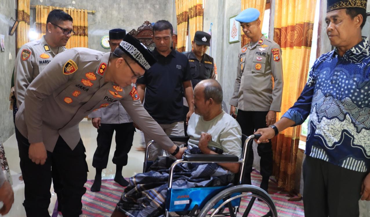 Secara simbolis, Kapolres Pidie AKBP Jaka Mulyana, SIK, MIK menyerahkan langsung satu unit kursi roda kepada seorang penyandang disabilitas, Aiyub Adam (58) yang berdomisili di Gampong Meunasah Peukan, Kecamatan Pidie.