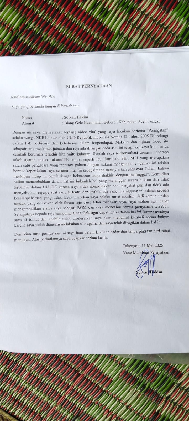 Setelah dipelajari dan di amati oleh ibu hamida (seorang pengacara kondang di Aceh tengah) ternyata video viral itu tidak terbentur dengan UUD ITE kata ibu hamidah, sehingga atas saran ibu hamidah buat surat sanggahan, lalu serahkan ke reje blang gele yang memfasilitasi tempat hadirnya para reje di acara mediasi beberapa waktu itu.