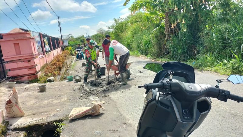 Keizalinnews.web.id|Redelong-:Kodim 0119/BM – Babinsa Koramil 06/Bukit Sertu Iqramunanda bersama warga masyarakat melaksanakan kegiatan kerja bakti gotong royong menutup lubang-lubang di jalan desa menggunakan semen, yang dilaksanakan di Desa Ujung Gele, Kecamatan Bukit, Kabupaten Bener Meriah, Minggu (06/07/2025).