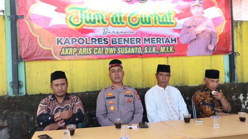 Keizalinnews.web.id|Redelong-:Dalam rangka mempererat sinergi antara kepolisian dan masyarakat, Wakapolres Bener Meriah, Kompol Dr. Syabirin, S.H., M.Si., menggelar kegiatan Jumat Curhat di Halaman Masjid Baburrahman, Kampung Batin Wih Pongas, Kecamatan Bukit, usai pelaksanaan salat Jumat, Jumat (11/07/2025).