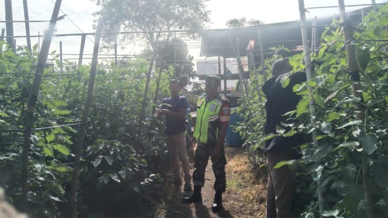 Dalam kegiatan Hanpangan, Babinsa Serka Erwandi mengecek tanaman Tomat di lahan milik Bpk Surya (43) sekaligus mendampingi dalam pembersihan dan membasmi Hama yang dapat merusak tanaman.