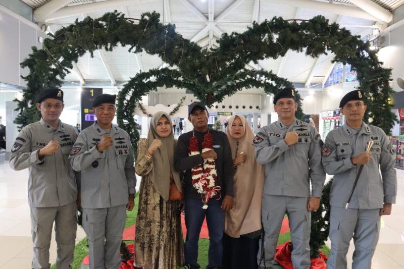 Kepala Zona Bakamla Tengah Laksma Bakamla Teguh Prasetya, S.T., M.M., CHRMP., yang diwakili oleh Kepala Bidang Operasi Zona Tengah Kolonel Bakamla Tio Togap Pasaribu, S.T., bersama keluarga korban, menyambut langsung kedatangan Jufri di Bandara Sam Ratulangi, Manado, Rabu (13/8/2025).