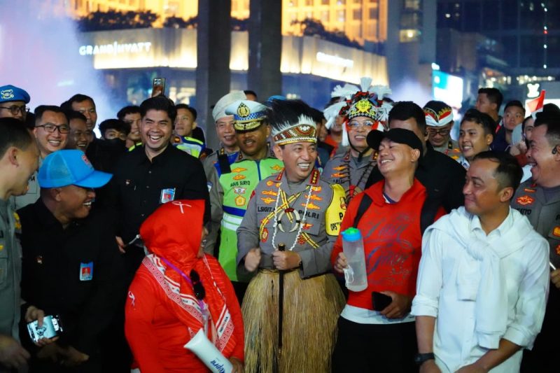 Kapolri Jenderal Listyo Sigit Prabowo hadir langsung di lokasi untuk meninjau jalannya kegiatan dan memastikan seluruh rangkaian berlangsung aman dan tertib. Didampingi Menteri Sekretaris Negara Prasetyo Hadi, Kapolri berkeliling menyapa warga, berdialog dengan peserta karnaval, serta menyaksikan penampilan di panggung rakyat yang menjadi daya tarik utama malam itu.