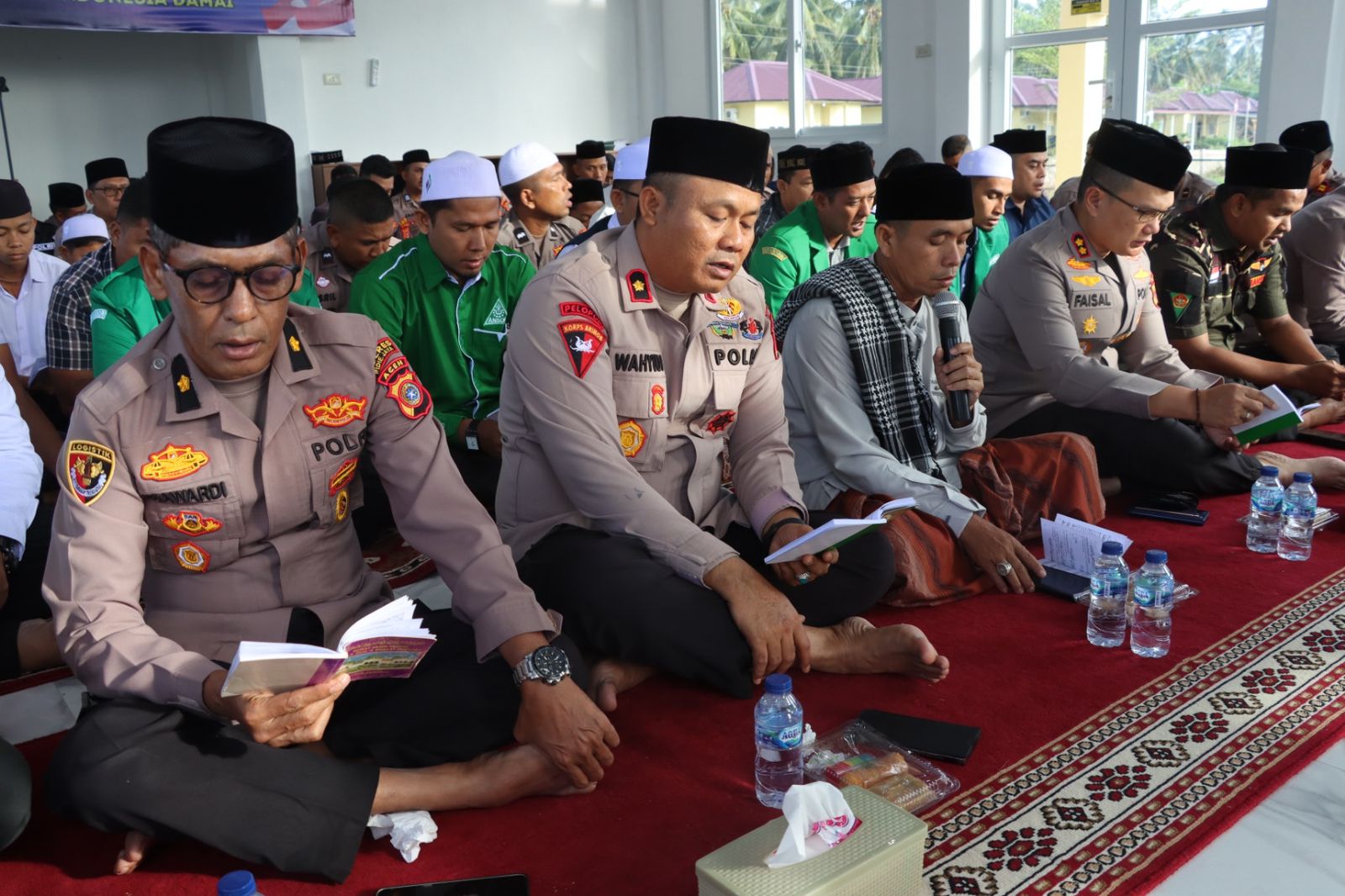 Turut hadir dalam kegiatan ini antara lain Kapolres Pidie Jaya, Wakapolres Kompol Iswahyudi, S.H., CHPR., CBA., para pejabat utama Polres, personel jajaran, serta Ketua GP Ansor Kabupaten Pidie Jaya Ustadz Muhammad Asrizal.