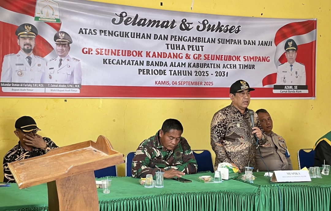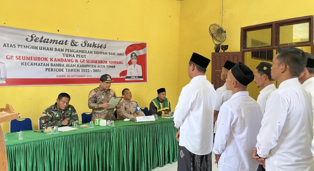 Aceh Timur – Suasana penuh khidmat mewarnai acara pengukuhan Tuha Peut Gampong (TPG) di Kecamatan Banda Alam. Usai prosesi resmi tersebut, Camat Banda Alam, Azani S.E, secara khusus menyampaikan ucapan selamat dan apresiasinya kepada jajaran TPG Gampong SNB Kandang dan Seunebok Simpang yang baru saja dikukuhkan, kegiatan pengukuhan tersebut di aula Kantor Camat Banda Alam kamis 4 September 2025.