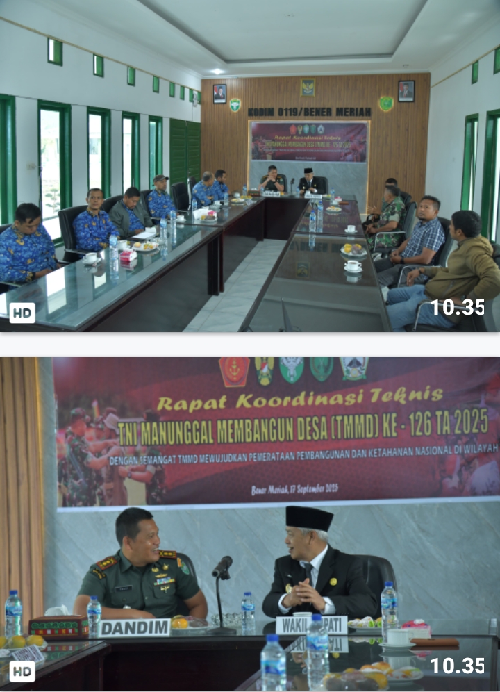 Keizalinnews.web.id|Redelong-:Kodim 0119/BM – Komandan Kodim 0119/Bener Meriah Letkol Inf Ahmad Fauzi bersama Forum Koordinasi Pimpinan Daerah (Forkopimda) Kabupaten Bener Meriah mengikuti Rapat Koordinasi Teknis (Rakornis) TNI Manunggal Membangun Desa (TMMD) ke 126 di Aula Makodim 0119/BM secara virtual, yang diselenggarakan oleh TNI Angkatan Darat, Rabu (17/09/2025).