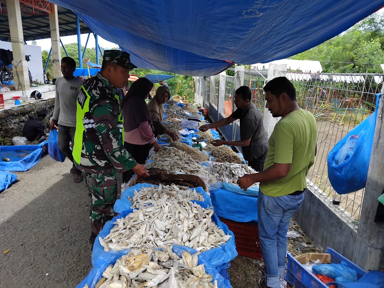 Babinsa Serda Wila Gunawan melakukan pengecekan terhadap harga-harga kebutuhan pokok seperti beras, minyak goreng, gula pasir, telur, dan sayur-mayur, serta berdialog dengan para pedagang untuk mengetahui kondisi distribusi dan pasokan barang.