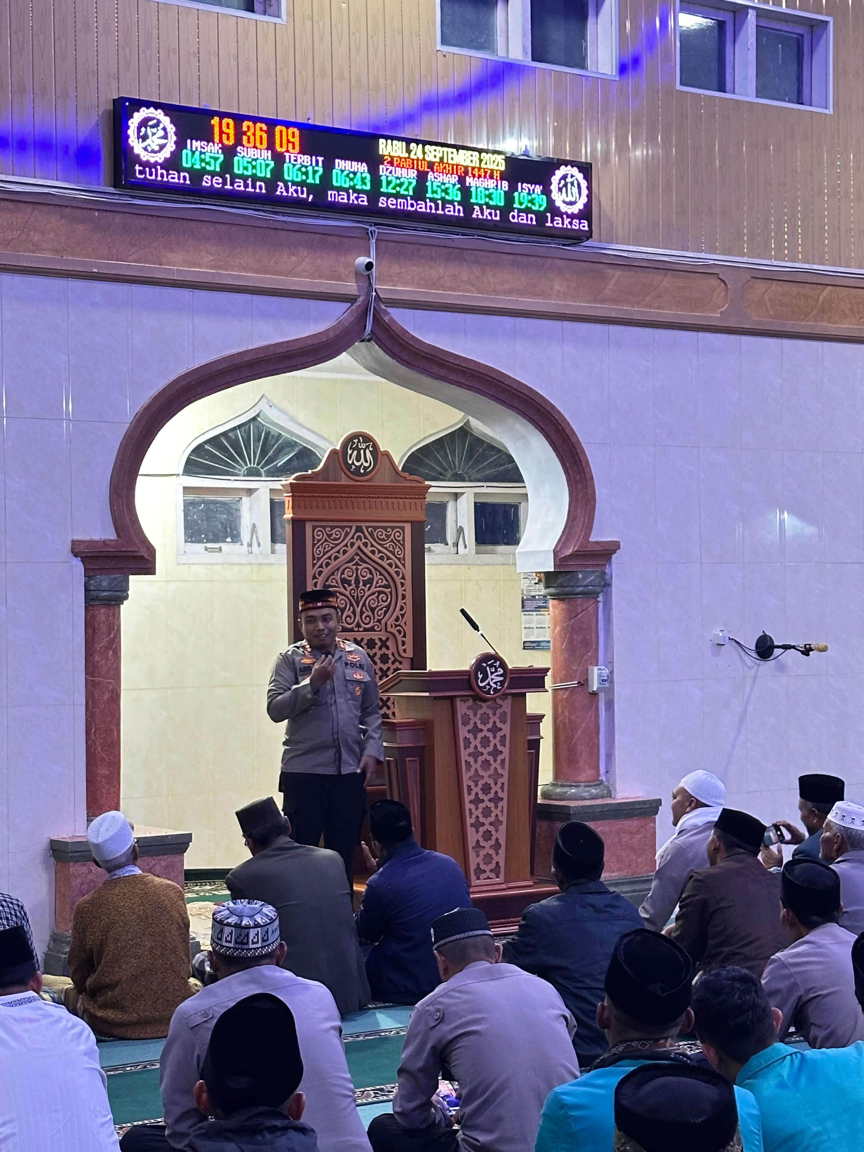 Acara diawali dengan shalat Magrib berjamaah, dilanjutkan dengan tausiyah, penyampaian pesan-pesan kamtibmas, hingga dialog bersama masyarakat. Dalam kesempatan itu, Kapolsek Bukit AKP H. Selode Ilen menekankan pentingnya kewaspadaan masyarakat terhadap kriminalitas, khususnya pencurian sepeda motor akibat kelalaian pemilik. Ia juga mengimbau warga agar memasang CCTV, menjaga keamanan rumah, serta menghindari bahaya narkoba.
