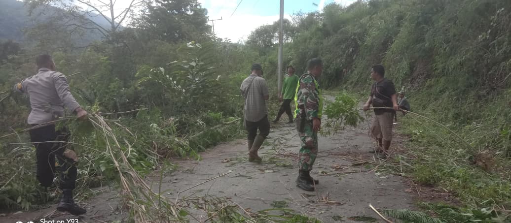 Dengan penuh semangat, Babinsa bersama warga saling bahu-membahu membersihkan rumput liar, sampah, dan material yang mengganggu di sepanjang jalan desa tersebut
