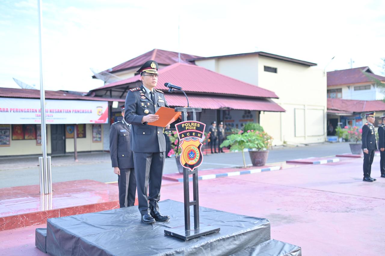 Kapolres Pidie AKBP Jaka Mulyana, SIK, MIK dalam amanatnya menyampaikan bahwa Hari Kesaktian Pancasila merupakan momentum penting untuk memperkokoh komitmen bersama dalam mengamalkan nilai-nilai luhur Pancasila dalam kehidupan sehari-hari.