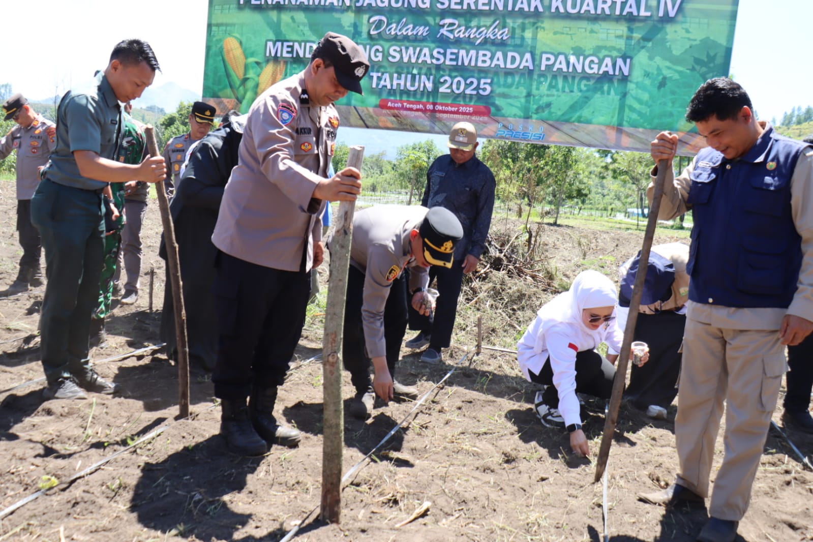 Keizalinnews.web.id|Takengon-:Sebagai wujud dukungan nyata terhadap program pemerintah dalam mewujudkan Swasembada Pangan Tahun 2025, jajaran Polres Aceh Tengah bersama unsur Forkopimda melaksanakan Penanaman Jagung Serentak Kuartal IV di lahan produktif Kampung Mulie Jadi, Kecamatan Silih Nara, Rabu (8/10/2025).