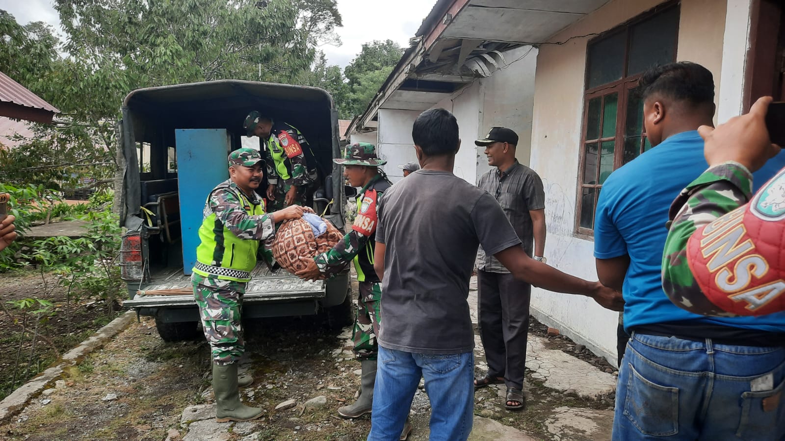 Keizalinnews.web.id|Redelong-: Demi kemudahan anggota satgas melaksanakan pengerjaan pembangunan rumah layak huni, kepala Desa mengerahkan masyarakatnya untuk membantu anggota satgas TMMD gerak cepat dengan secara gotong royong memindahkan material ke tempat yang lebih aman untuk sementara.