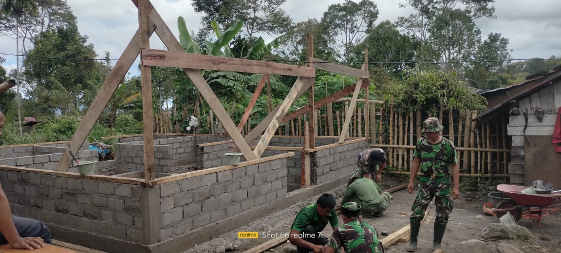Dengan semangat gotong royong, personel TNI bersama warga setempat bahu-membahu menyelesaikan tahapan pekerjaan mulai dari pondasi, dinding, hingga atap rumah.
