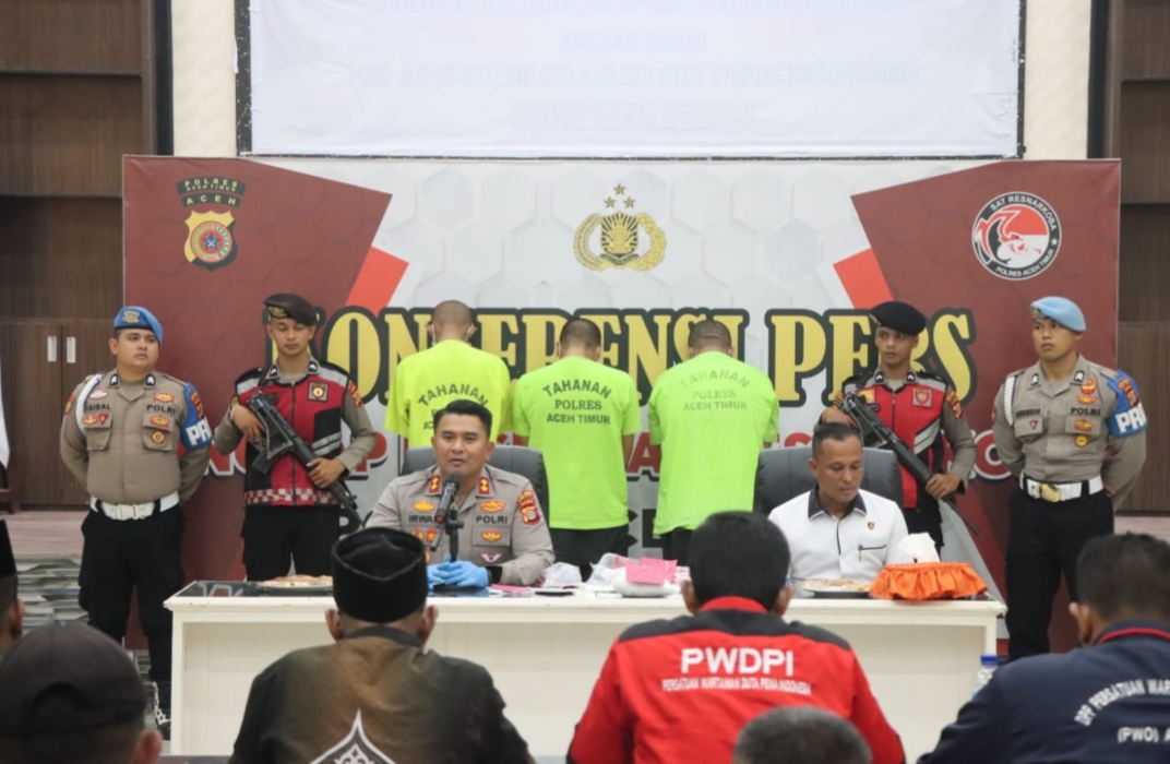 Satresnarkoba Polres Aceh Timur, Polda Aceh berhasil mengungkap kasus penyalahgunaan narkotika jenis sabu dengan mengamankan tiga tersangka berinisial IR, 36 tahun, Wiraswasta, warga, Kecamatan Manyak Payed, Kabupaten Aceh Tamiang, SA, 41 tahun, Wiraswasta, warga Kecamatan Peureulak Timur dan DE, 32 Wiraswasta, warga Kecamatan Karang Pawitan, Kabupaten Garut, Jawa Barat.