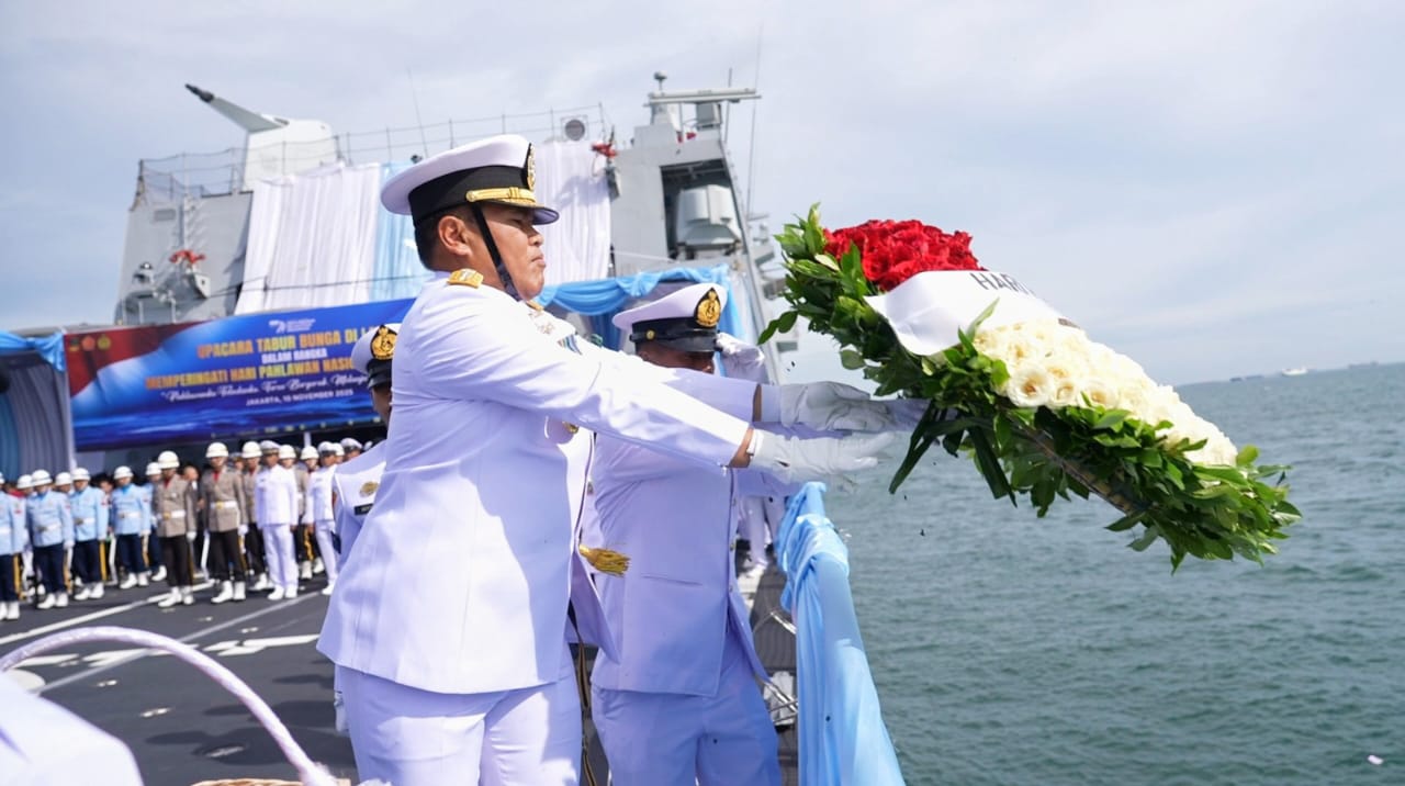 KeizalinNews.web.id Jakarta — Komandan Sekolah Staf dan Komando Angkatan Laut (Danseskoal) Laksamana Muda TNI Ariantyo Condrowibowo diwakili Wakil Komandan (Wadan) Seskoal Laksamana Pertama TNI Dr. Ferry Supriady, S.T., M.M., M.Tr.Opsla., CIQaR.. mengikuti upacara tabur bunga di laut dalam rangka memperingati Hari Pahlawan tahun 2025, dengan Inspektur Upacara Kepala Staf Angkatan Laut (Kasal) Laksamana TNI Dr. Mohammad Ali, S.E., M.M., M.Tr.Opsla., bertempat di geladak KRI Brawijaya 320 yang berlayar dari Dermaga Tanjung Priok menuju perairan Teluk Jakarta, Senin (10/11/2025).