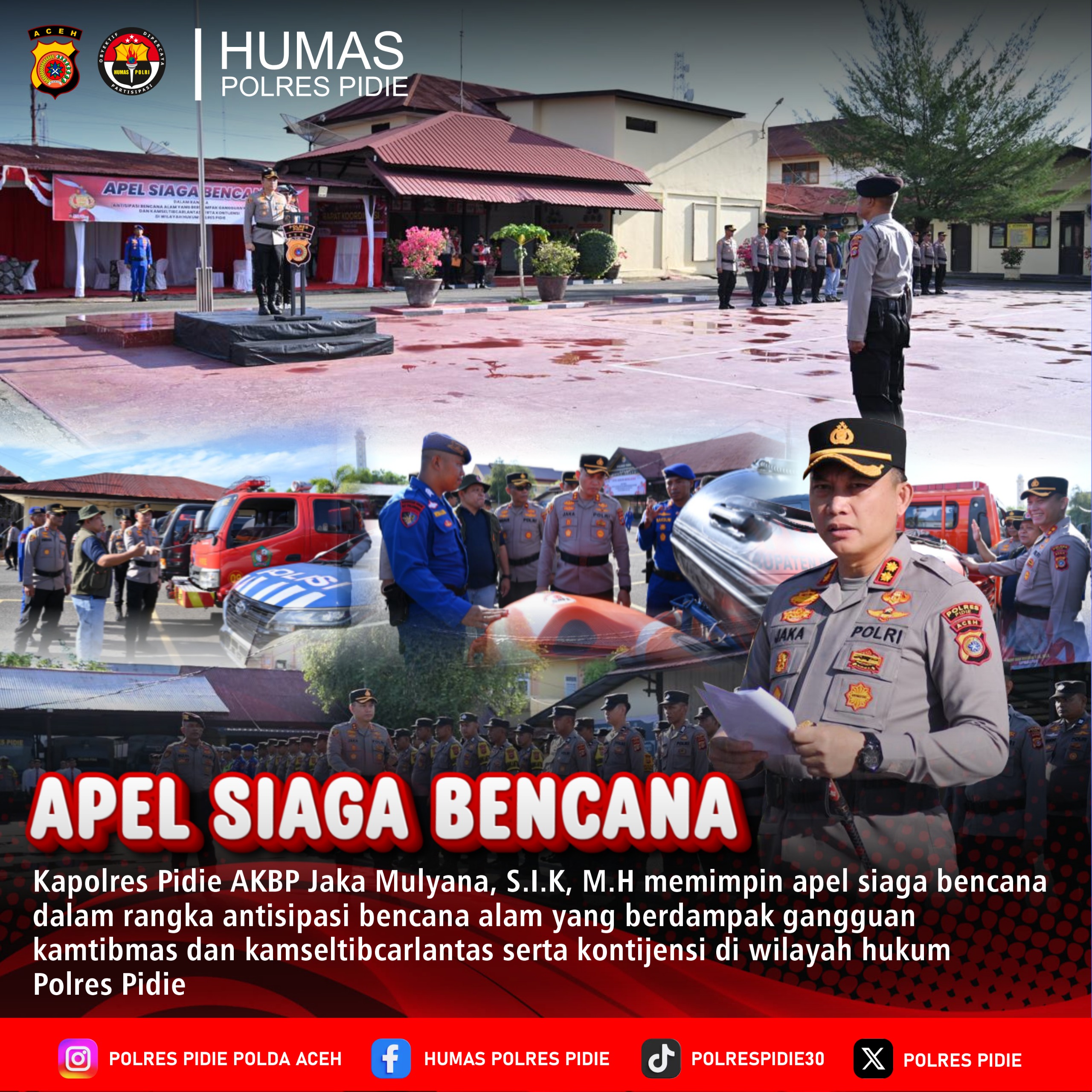 Kegiatan tersebut dipimpin oleh Kapolres Pidie dan diikuti oleh Personel Polres Pidie, TNI, BPBD, serta instansi terkait lainnya sebagai bentuk kesiapsiagaan terpadu dalam menghadapi potensi bencana.