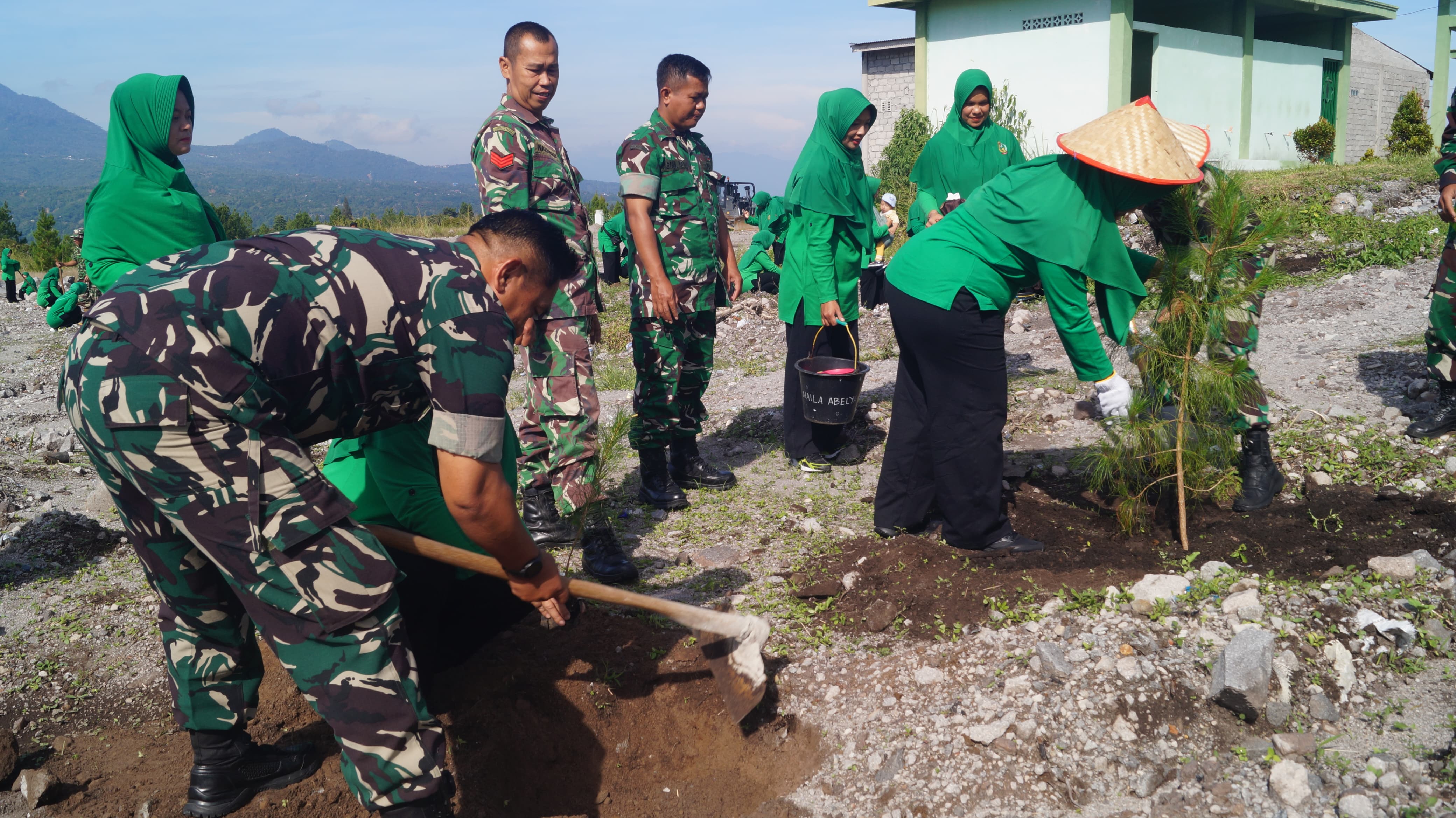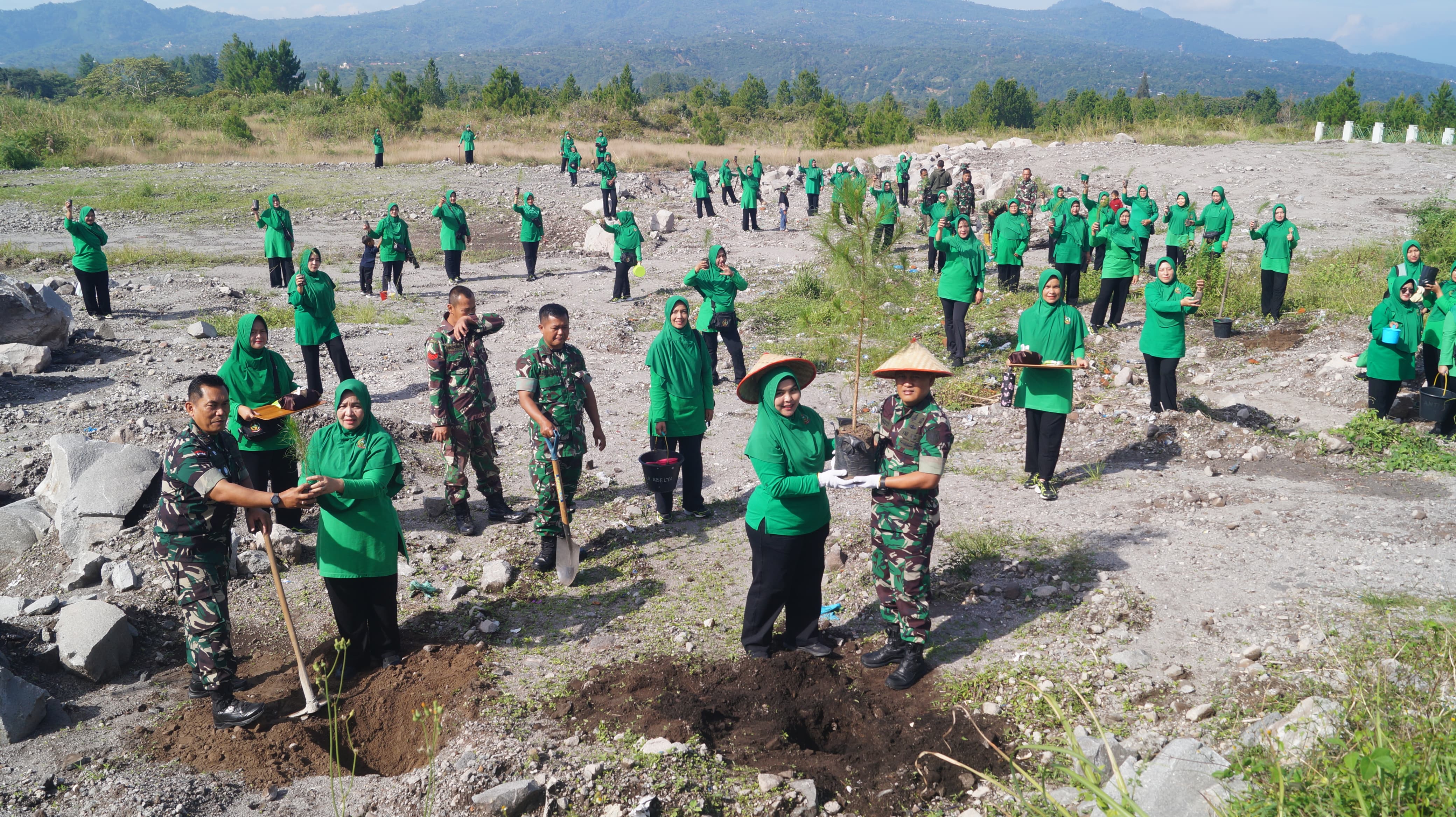 Dalam aksi penghijauan tersebut, turut dihadiri oleh Dandim 0119/BM Letkol Inf Ahmad Fauzi, Kepala Staf. Kapten Czi Aep Mukhran Halid dan para Ibu Ibu Persit KCK Cabang XXV Dim 0119/BM