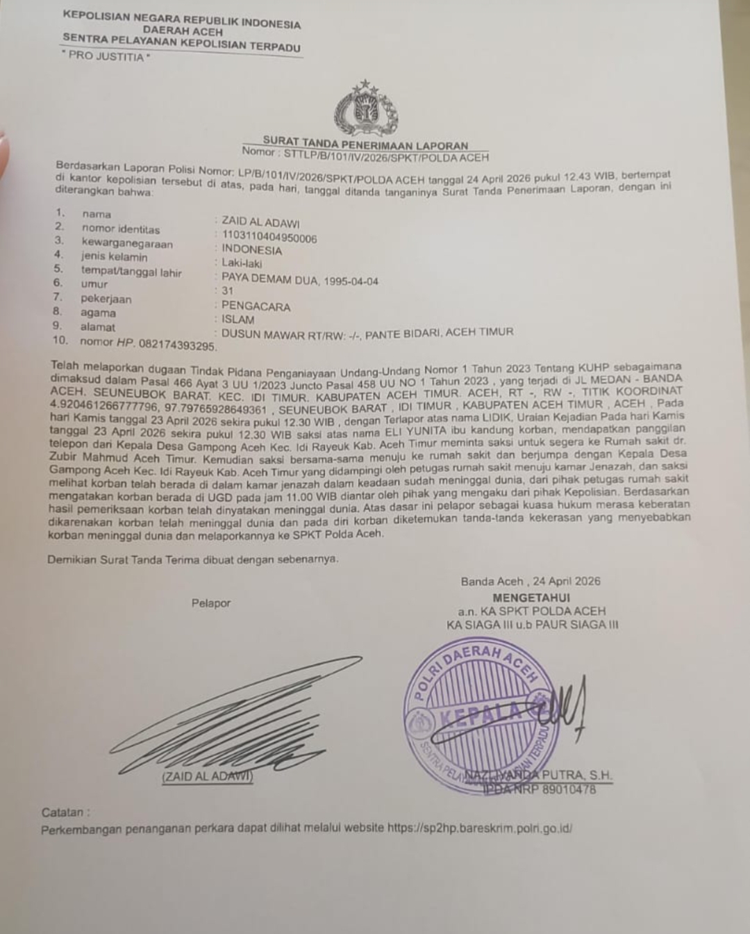 melaporkan perkara tersebut ke Polda Aceh sesuai surat tanda bukti lapor Nomor : STTLP/B/101/V/2026/SPKT/POLDA ACEH tertanggal 24 April 2026, dengan dugaan penganiayan yang menyebabkan kematian atau pembunuhan yang sebagaimana dimaksud dalam ketentuan Pasal 466 ayat (3) dan atau Pasal 458 UU No 1 Tahun 2023 tentang KUHP.