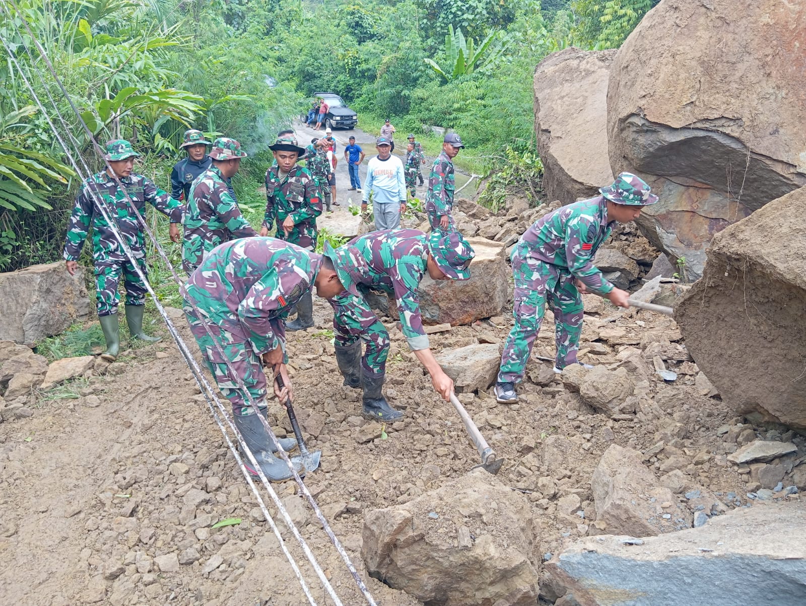 Keizalinnews.Online|Redelong-: Prajurit Yonif 114/Satria Musara, Kipan D bergerak cepat dan sigap untuk menyingkirikan material longsor berupa tanah keras, batu besar, kayu patahan pohon dengan…
