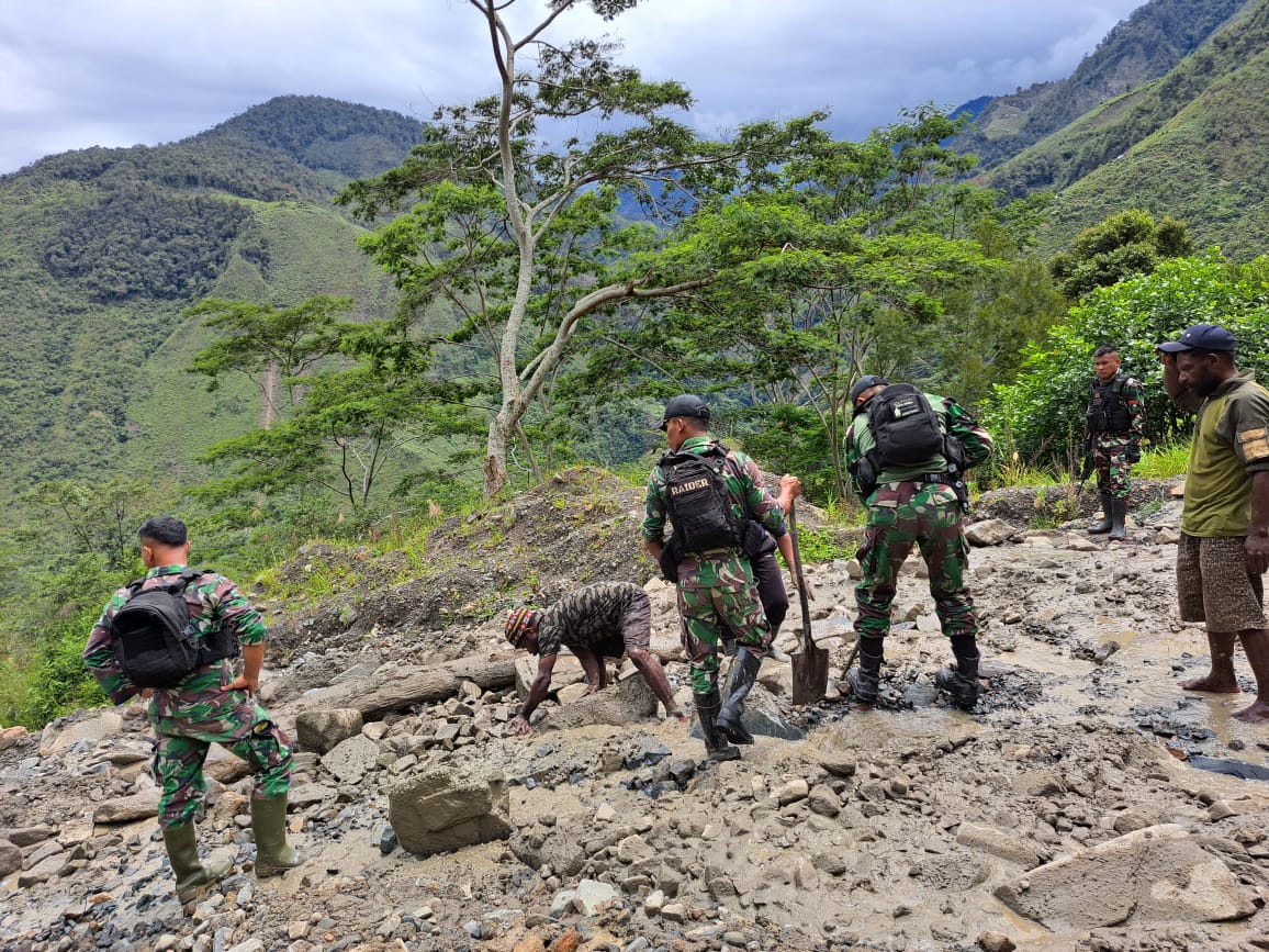 KeizalinNews Tolikara -Satgas Yonif Raider 142/KJ bersama dengan warga memperbaiki jalan yang terputus di Distrik Kuari dimana jalan tersebut merupakan jalan penghubung antara Kabupaten…