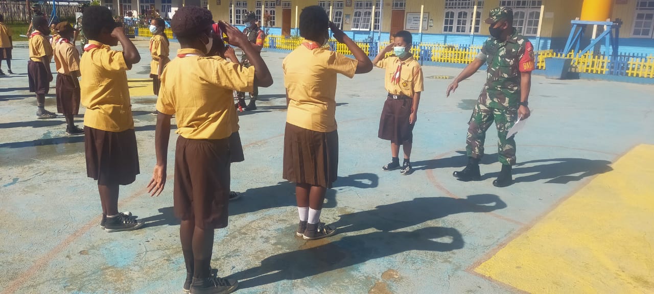 KeizalinNews.com Enarotali — Babinsa Koramil 1703-01/Enarotali Serda Yayan Andri dan Serda Ahmad Bahrul mengajar PBB (Peraturan Baris Berbaris) kepada anak-anak Pramuka SD YPPGI Kepas…