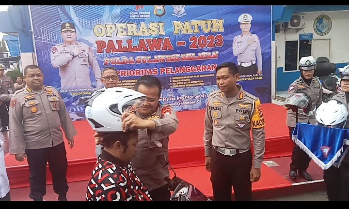 KeizalinNews.Com, Makassar (Sulsel) — Hari Ketiga Operasi Patuh Pallawa 2023 , Kapolda Sulsel Irjen Pol. Drs. Setyo Boedi Moempoeni Harso, S.H., M.H Bagikan Helm…